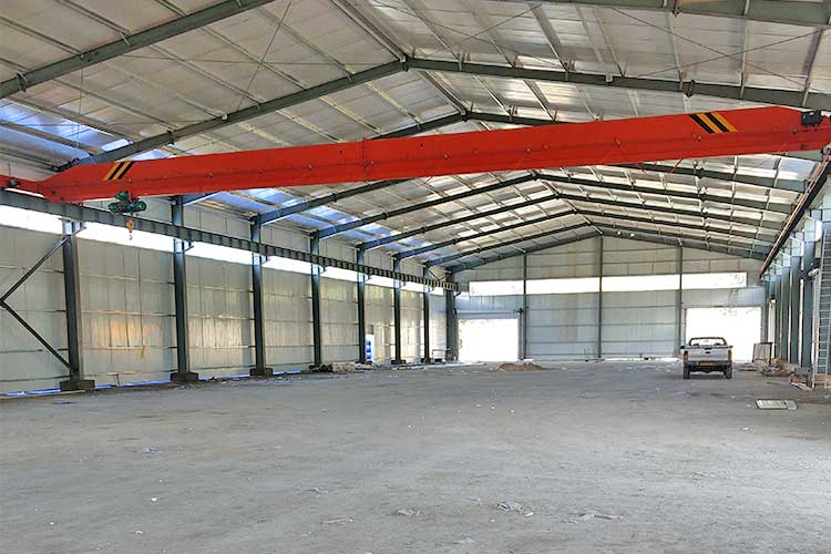When there is a crane, we must consider the different loads of crane beams and ordinary frame beams. For example, generally speaking, if the customers need a 5-ton or 10-ton crane, so the eave height should be designed to more than 7m. According to our many years’ design experience, it is found that the most economical column distance is 7-9m under the standard load. When the span is more than 48m, a multi-span steel frame can save more cost.