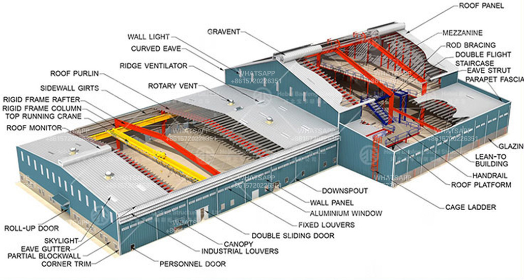 The main frame of the building—columns, beams, trusses, and other elements—is made of steel. The walls and roof are often made of lighter materials like insulated metal panels, creating an efficient and strong enclosure.