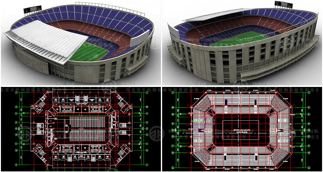 Design: Steel Stadiums often feature a combination of steel frames, trusses, and other structural elements that provide support and stability. The design can include cantilevered roofs, retractable roofs, and large open spaces for seating and viewing.